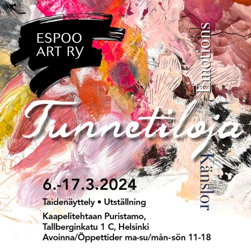 - Kaapelitehtaan Puristamo, Helsinki. Espoo Art ry:n kevätnäyttely Tunnetiloja 6.-17.3.2024