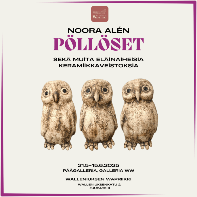 - Walleniuksen Wapriikki Pieni Galleria, Galleria WW, Juupajoki, Pöllöset sekä muita eläinaiheisia keramiikkaveistoksia NÄYTTELY JATKUU YLEISÖN PYYNNÖSTÄ hieman pienempänä Pienen Gallerian puolella ajalla 18.6.-13.7.2025.
