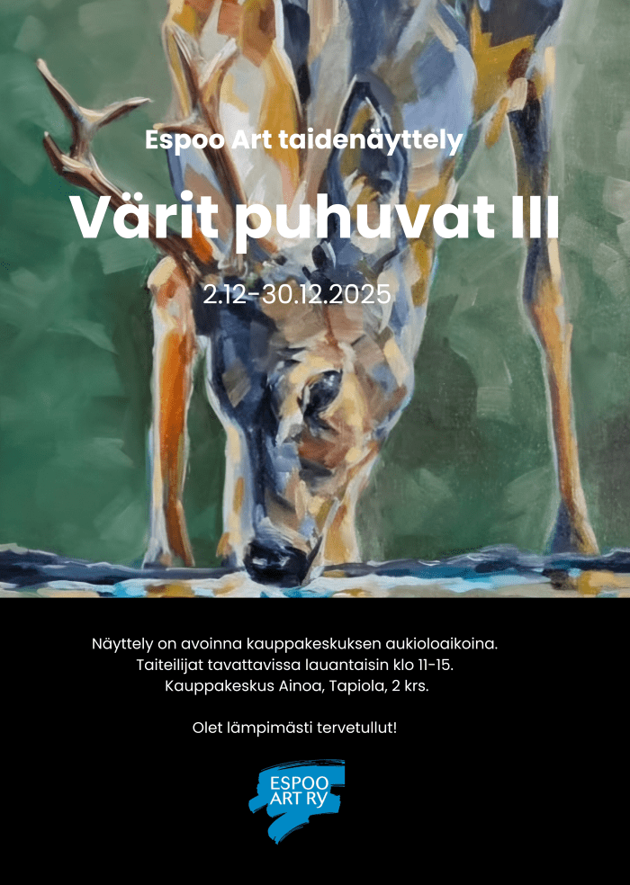 - Kauppakeskus Ainoa, Tapiola. Espoo Art taidenäyttely – Värit puhuvat III, yhteisnäyttely 2.12.-30.12.2025